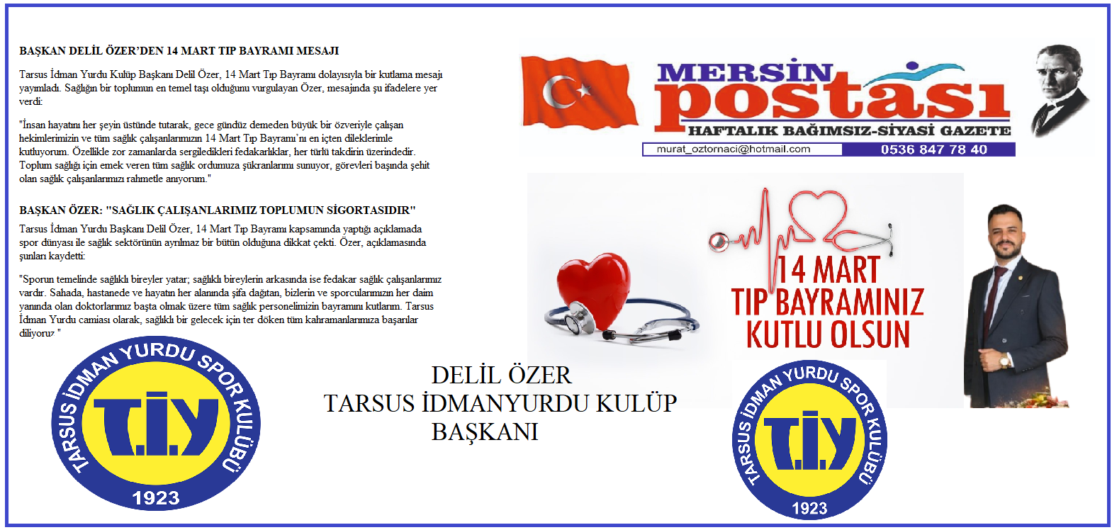 Tarsus İdman Yurdu Kulüp Başkanı Delil Özer, 14 Mart Tıp Bayramı dolayısıyla bir kutlama mesajı yayımladı. Sağlığın bir toplumun en temel taşı olduğunu vurgulayan Özer, mesajında şu ifadelere yer verdi: