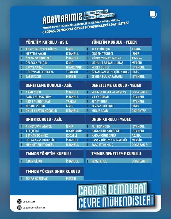 Türk Mühendis ve Mimar Odaları Birliği’ne (TMMOB) bağlı Çevre Mühendisleri Odası’nın (ÇMO) 18. Olağan Genel Kurulu sürecinde aday listeleri netleşti.