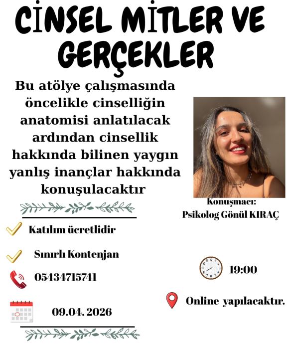 Mersin’de düzenlenecek “Cinsel Mitler ve Gerçekler” atölyesi, cinsellik konusunda toplumda yaygın olan yanlış inanışları ele alarak katılımcılara bilimsel ve doğru bilgiler sunmayı amaçlıyor. Online olarak gerçekleştirilecek etkinlikte konuşmacı olarak Psikolog Gönül Kıraç yer alacak.